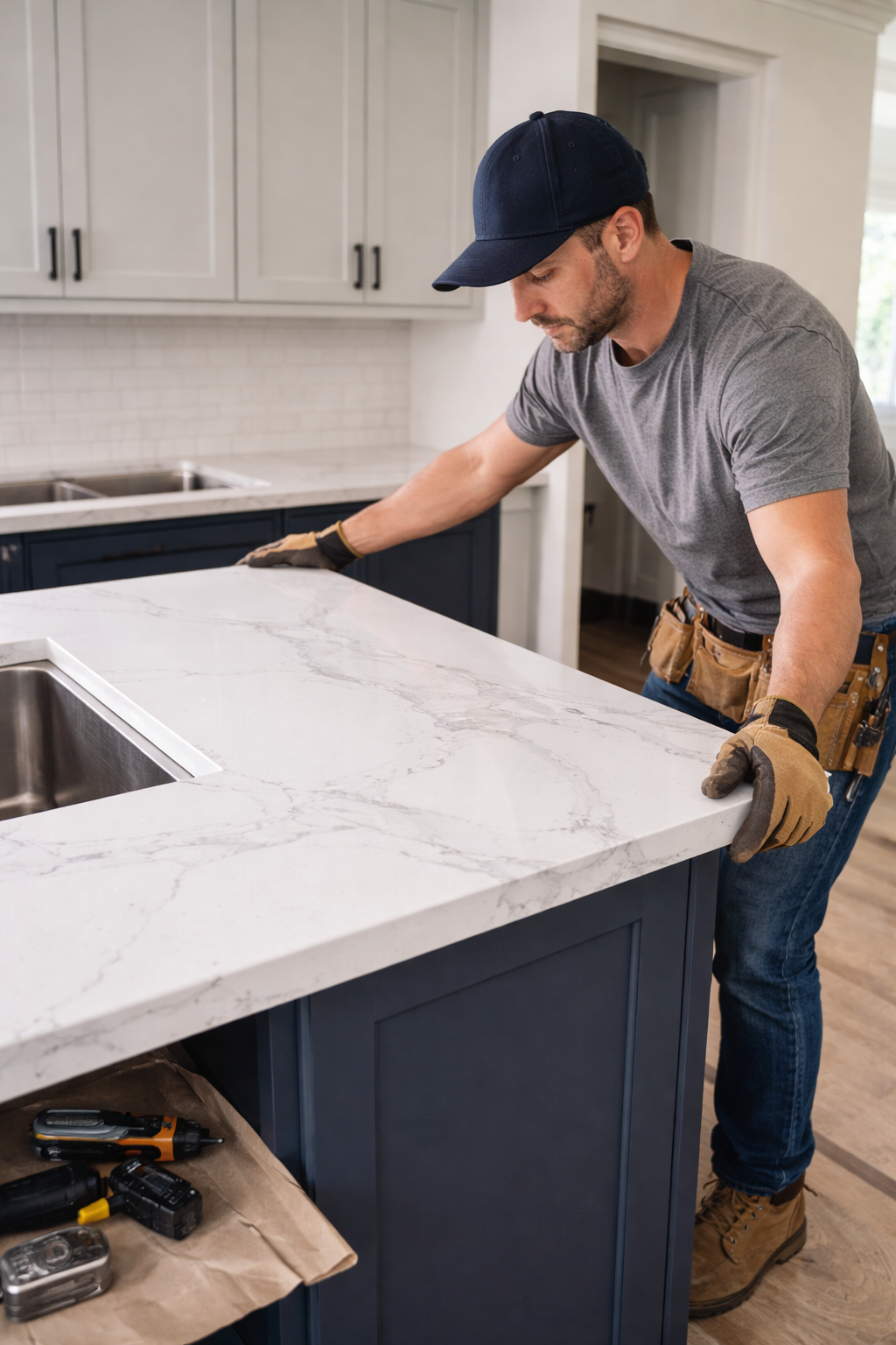 Cabinets and countertops are installed with proper alignment, secure fitting, and attention to structural stability, followed by a final inspection to ensure everything is finished correctly